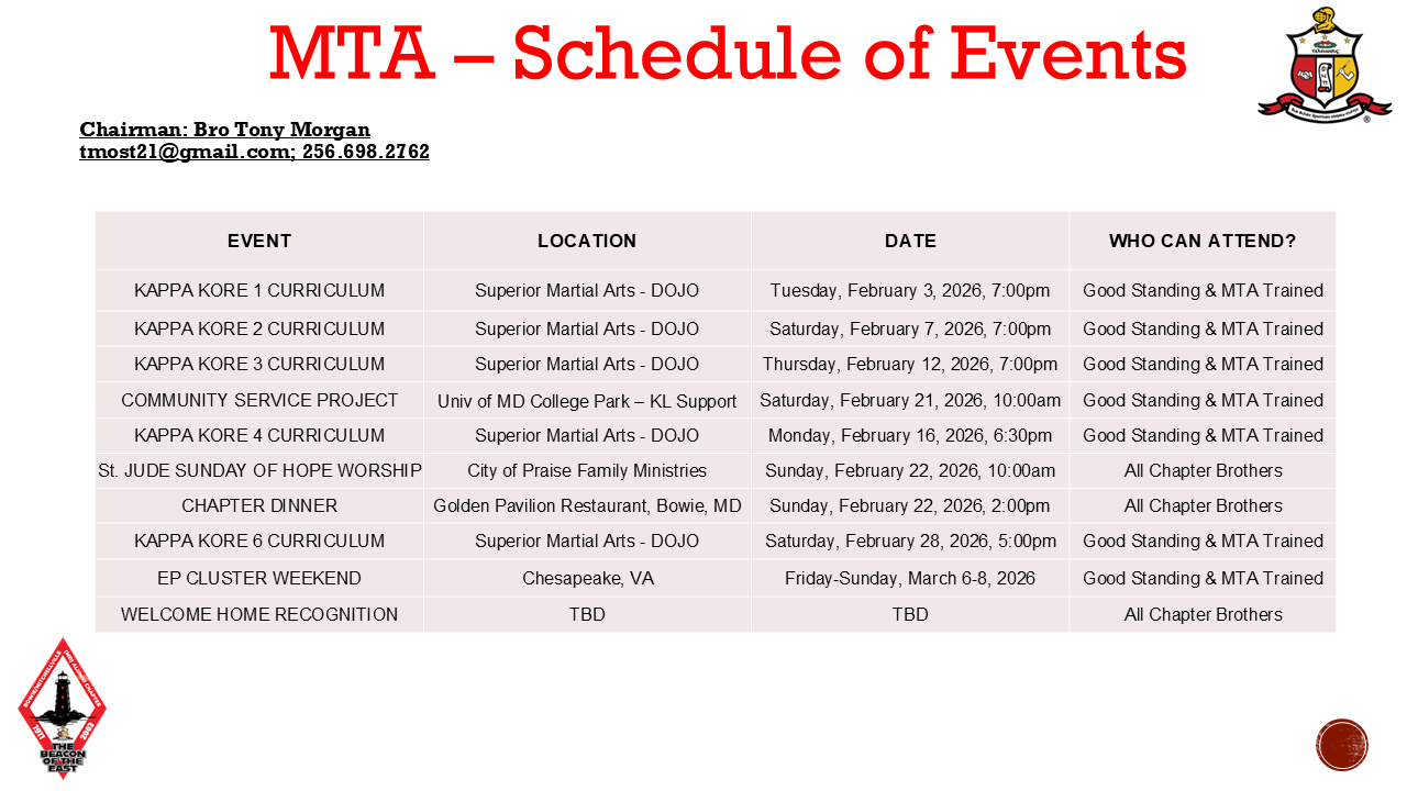 Below is the MTA - Schedule of Events. You must be in Good Standing & MTA Trained to attend any KAPPA KORE CURRICULUM. No EXCEPTIONS.